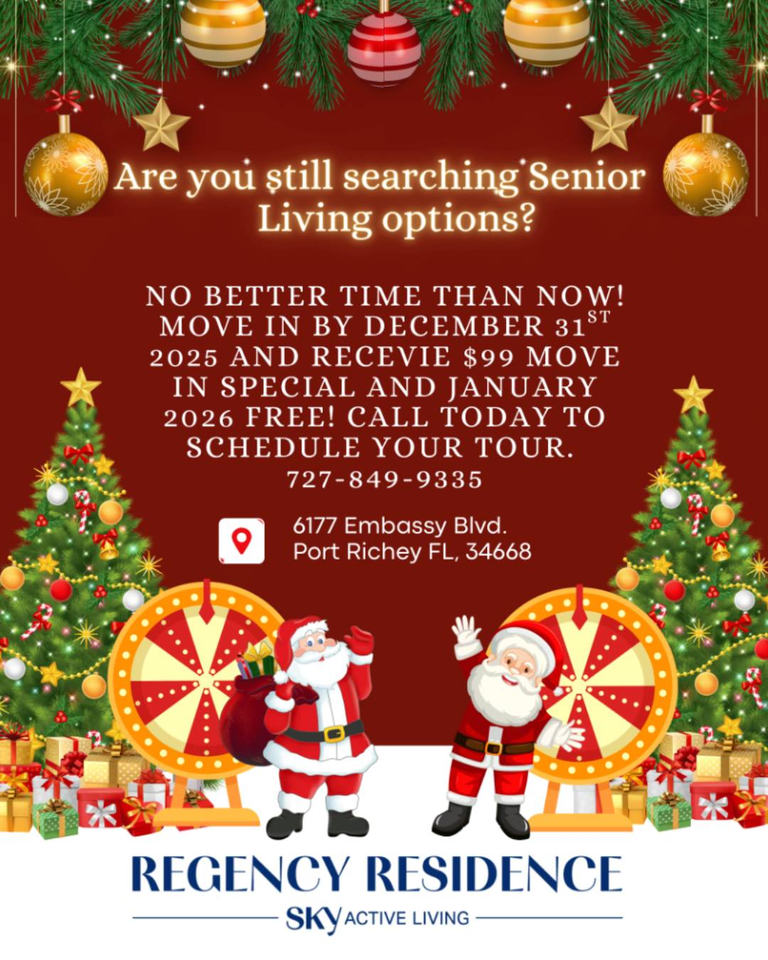 This holiday move-in special is available for a limited time, and availability is limited. Scheduling a tour is the best way to experience the community firsthand and learn more about how Regency Residence Sky Active Living can support you or your loved one.
